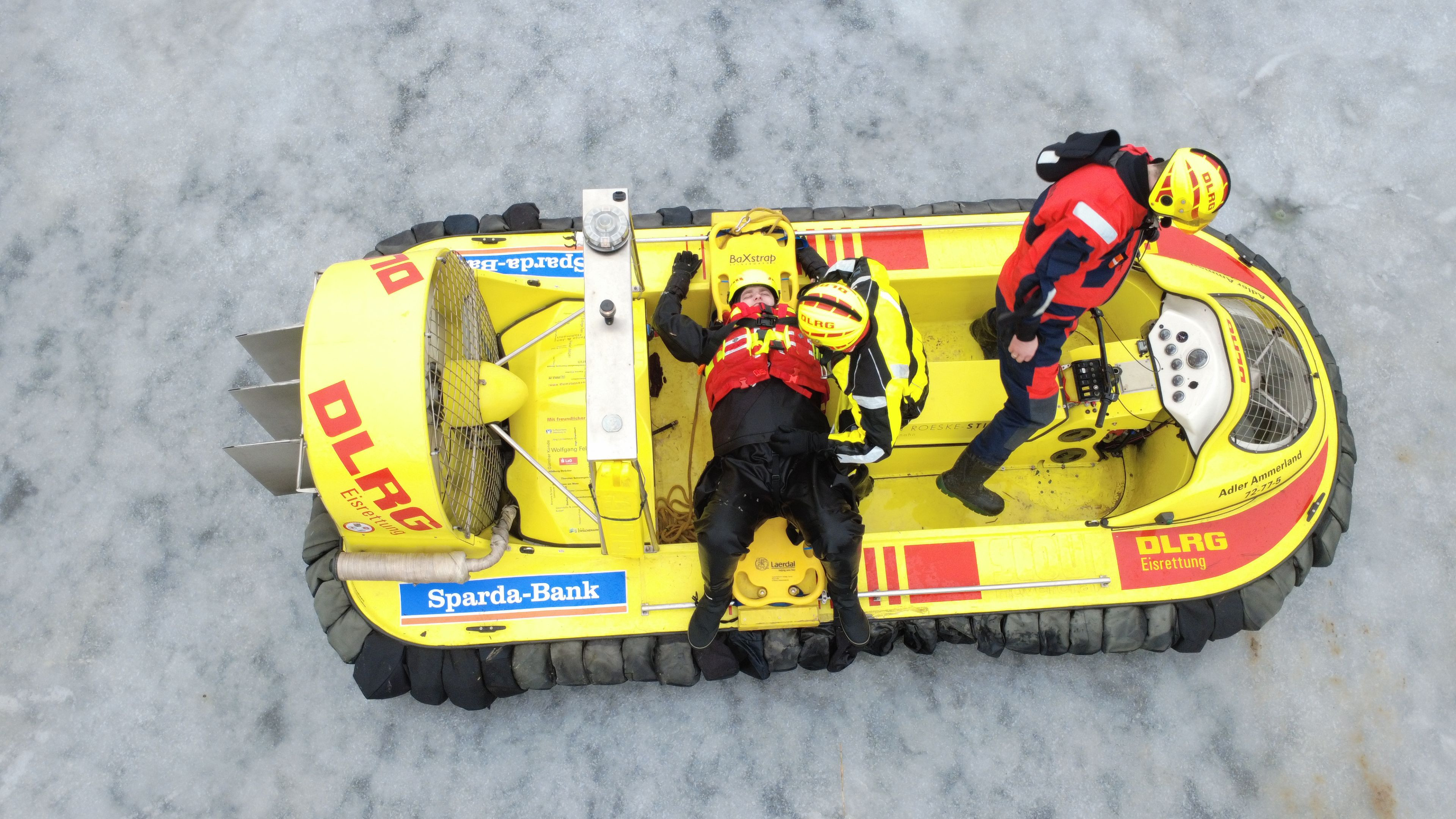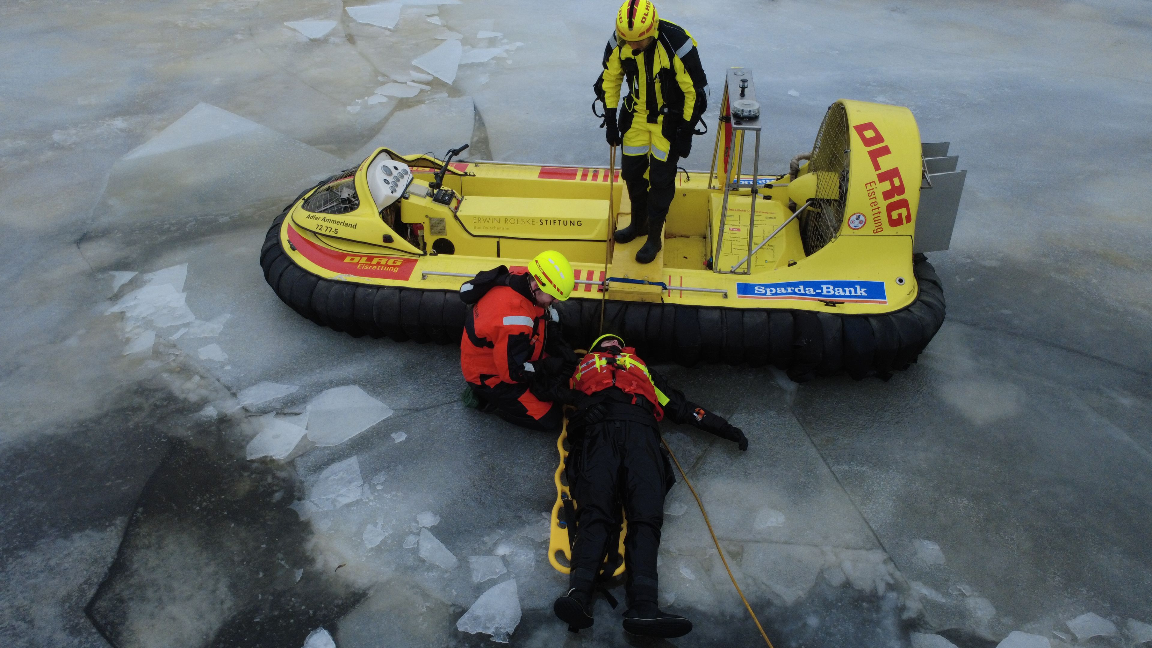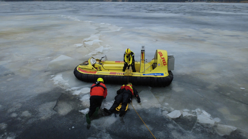 Es bot sich an diesem Wochenende die Gelegenheit, dass alle "Luftkissenbootkapitäne" wieder genügend Routine im Umgang mit dem speziellen Eisrettungsfahrzeug bekommen konnten, um die besonderen Einsätze auf dem Eis zu bewältigen.